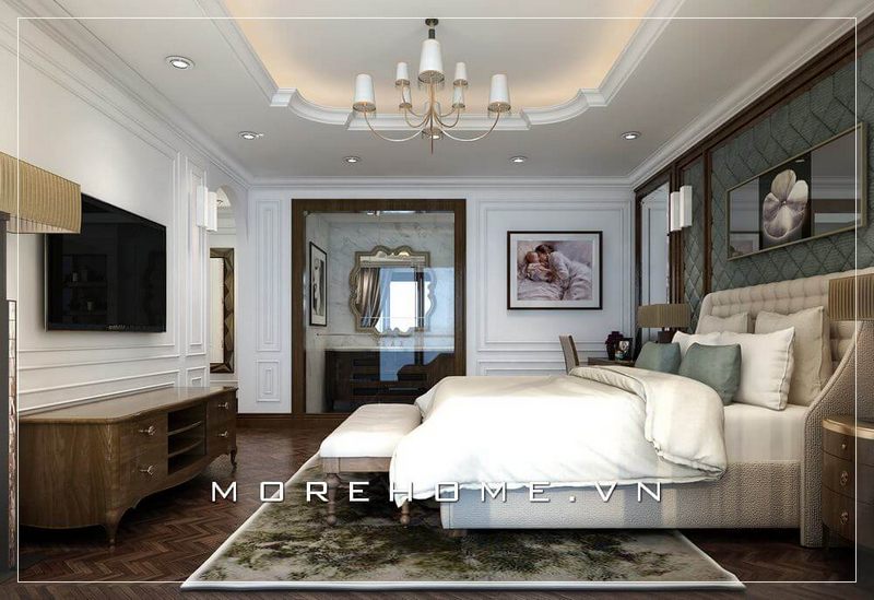 Giường ngủ master độc đáo với đường nét tân cổ điển từ gỗ óc chó kết hợp cùng tone trắng nhẹ nhàng đã tạo nên không gian phòng ngủ sang trọng, thanh lịch.