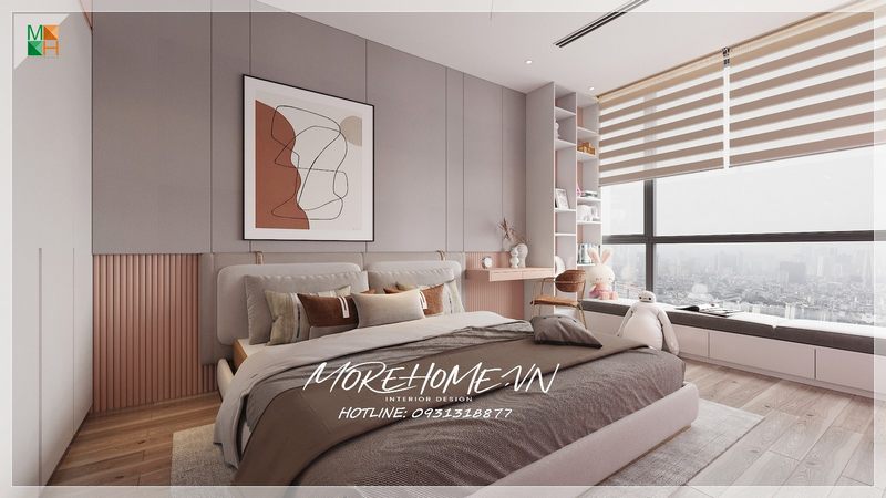 Mẫu giường ngủ con gái tại nhà phố hiện đại, tab đầu giường liền mạch tạo sự thuận tiện cho con trong quá trình sử dụng