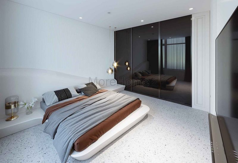 Giường ngủ phòng 2 người bọc nỉ nhung đầu giường sang trong, từng đường nét chạm khắc tỉ mỉ kết hợp màu trắng thanh thoát tạo nên một không gian nghỉ ngơi đẳng cấp, thoải mái nhất