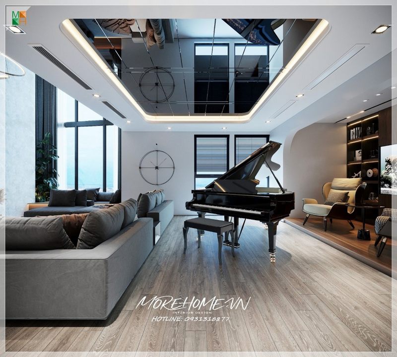 Phối cảnh không gian phòng khách có piano đẹp, hiện đại, độc đáo.