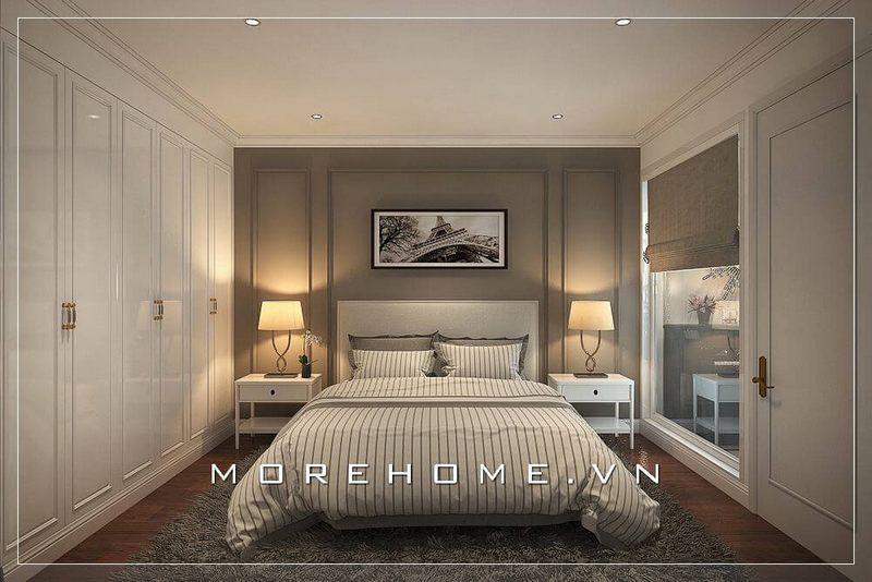 Mẫu thiết kế nội thất nhà phố hiện đại, tủ quần áo kích trần âm tường là giải pháp hiệu quả được sử dụng cho không gian phòng ngủ nhỏ