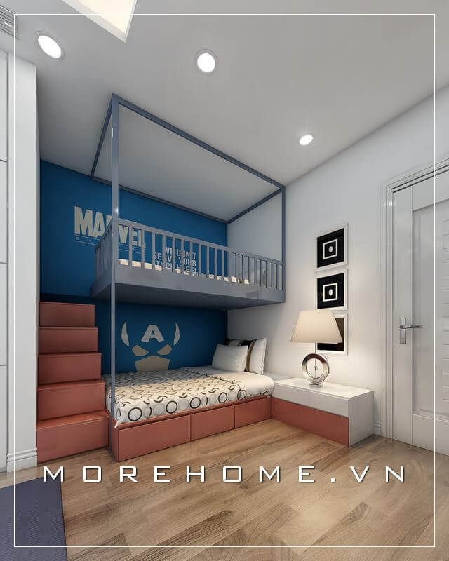 Mẫu giường tầng với thiết kế hiện đại và ấn tượng cũng được sử dụng phù hợp với khéo léo để tiết kiệm không gian tối đa nhất cho con bạn vừa có không gian nghỉ ngơi và học tập thoải mái nhất