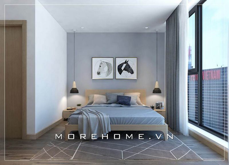 Mẫu nội thất phòng ngủ chung cư hiện đại với sự kết hợp hài hòa giữa giường ngủ gỗ công nghiệp và tab đầu giường tạo cho gia chủ thuận tiện hơn trong quá trình sử dụng