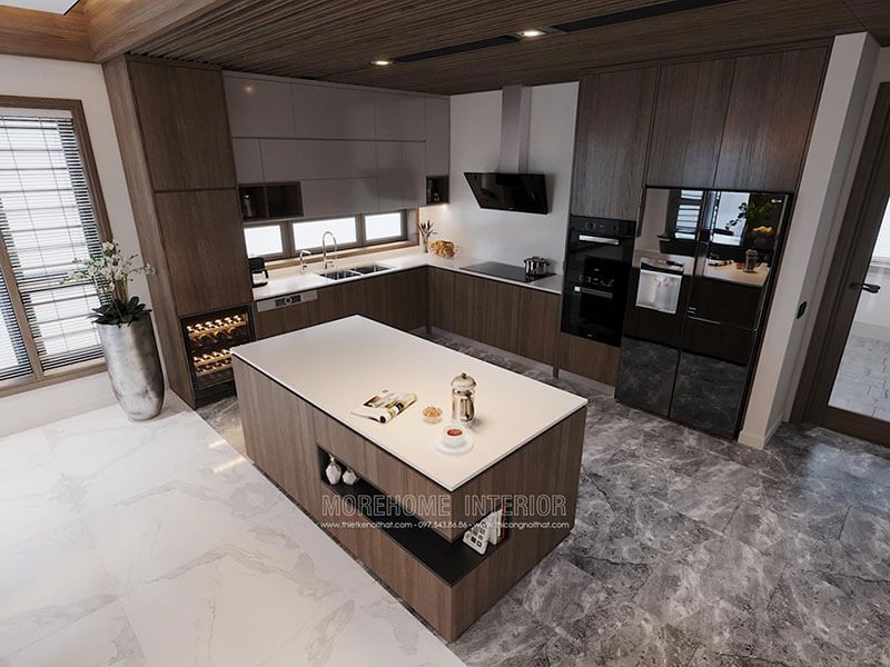 MoreHome chia sẻ đến bạn mẫu thiết kế phòng bếp dành cho biệt thự, nhà phố có phần đá ốp chân bàn đảo màu xanh xám sáng tạo