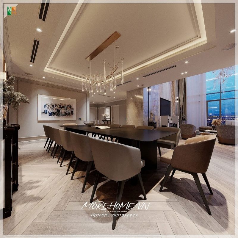 Mẫu bàn ăn cao cấp với thiết kế hiện đại, được làm từ gỗ và mặt đá trắng, sẽ là một lựa chọn tuyệt vời cho phòng ăn chung cư của bạn với 6 ghế.